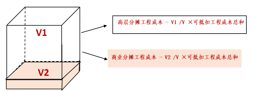即轉讓的建筑面積占可轉讓總建筑面積的比例進行分攤。這里的建筑面積實際上指的是可售建面,一般只指的是地上可售建面,不包含地下車庫。通常對于工程成本采用的分攤方式為建筑面積分攤。如下圖示意:V為項目地上總可售建面,高層及商業建面分別為V1和V2。