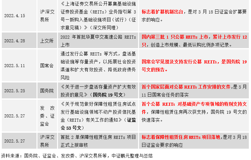 2022年3月18日,證監會發布《深入推進公募REITs試點,進一步促進投融資良性循環》,研究出臺擴募機制和推進保障性租賃住房REITs項目試點。隨后,交易所發布擴募機制征求意見稿,證監會53號文落地,專項支持發展保障性租賃住房REITs,同時兩單項目正式上報交易。