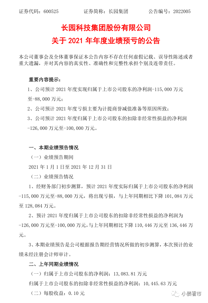 公告顯示,長園集團預(yù)計2021年度虧損主要為計提商譽減值準備等原因所致,其預(yù)計2021年度歸屬于上市公司股東的扣除非經(jīng)常性損益的凈利潤-12.6億元至-10億元。