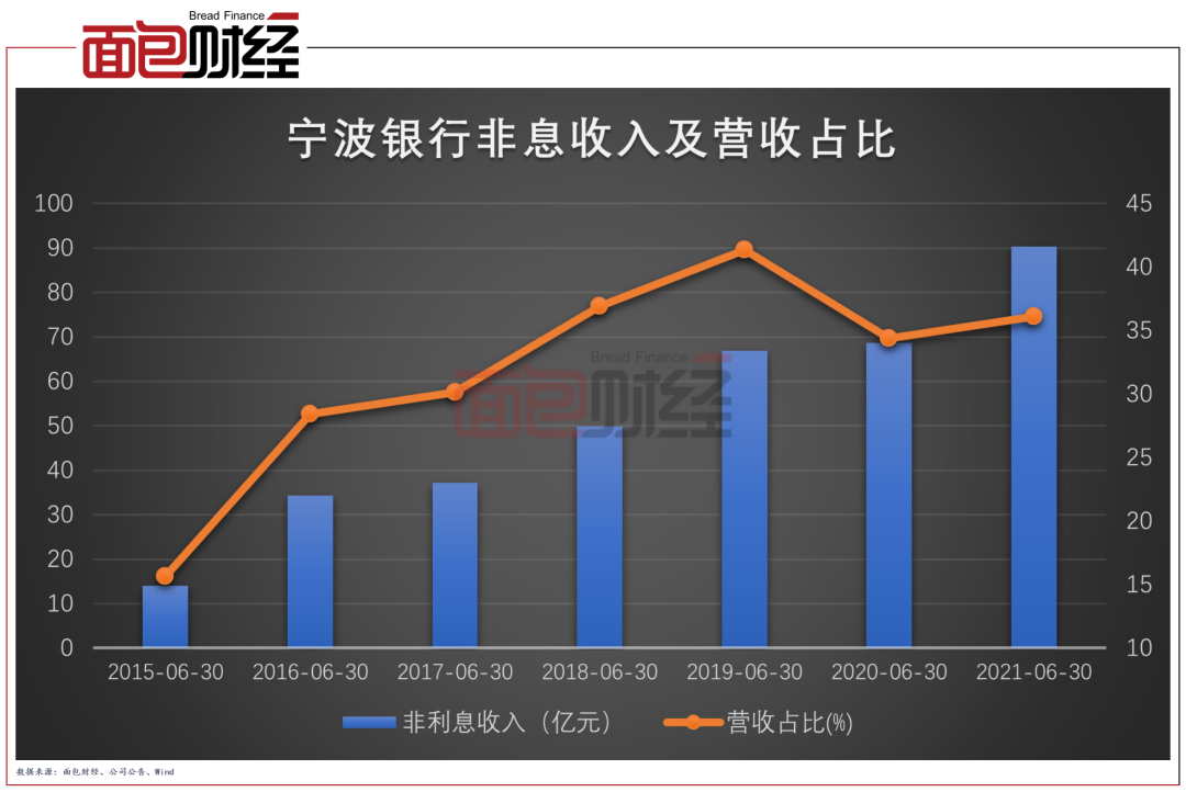 2021上半年,該行實現非利息收入90.36億元,較上年同期增加21.66億元,增幅為31.53%。其在營收中的占比也由2015年中期的15.65%提升至2021年中期的36.12%。