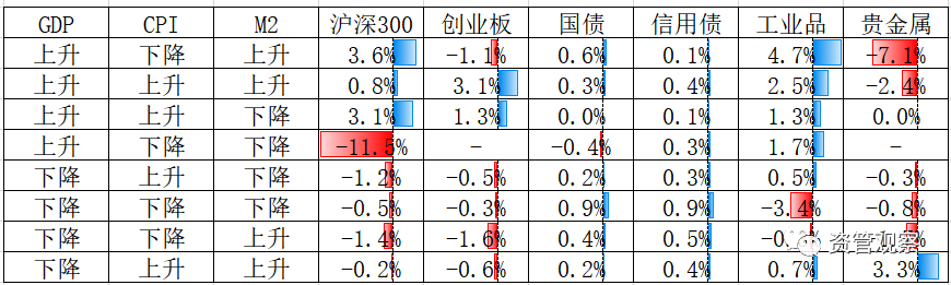 從周期角度來看,利用經濟周期和金融周期雙周期疊加來進一步分析不同周期形勢的資產價格走勢,這里以GDP增速、CPI、M2作為變量,在不同狀態下檢驗過往資產價格的走勢。通過分析可以辨別出,三個變量組成了八種情景,總體而言經濟擴張階段風險資產表現更為優良,下行階段安全資產表現更為優異,同時不同經濟階段的金融周期對應的資產表現也不相同,具體而言,經濟擴張階段的上行金融周期風險金融資產表現更佳,而經濟收縮階段的上行金融周期則有利于安全金融資產。展望2021年,GDP處于上升態勢,CPI處于下行態勢,而M2處于下行態勢,這種情況下可能資產走勢有些復雜,總體而言大宗商品表現更好,而股市和債市表現不佳。