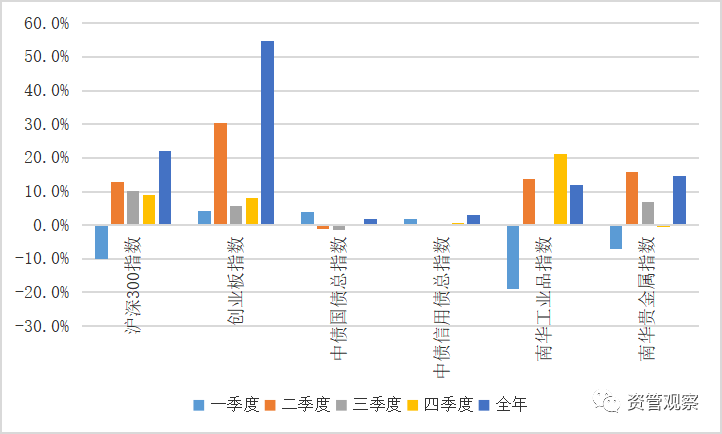 從歷史規律來看,如果比照歷史重大事件后的相似環境,可能只有2010年具有一定參考性,這主要在于2008年爆發的全球危機一致持續至2009年,在全球的努力下才獲得平息,2010年的宏觀金融走勢會與2021年具有很大相似處。一是經濟走勢形態很相似,受到全球金融危機沖擊,2009年一季度經濟增速處于最低點,之后開始復蘇,在2020年一季度達到季度最高點,而2021年受到基數原因也有望達到近幾個季度最高點。二是從政策刺激方面,為應該全球金融危機,我國推出了四萬億經濟刺激政策,央行大幅下調存款準備金率和基準利率,在經濟復蘇后,2010年刺激政策逐步退出,這個政策節奏與今年和明年的走勢也較為相似。三是從通脹看,尤其是PPI方面,這兩個年份都是在前一年受到需求沖擊后,2010年實現了PPI的大幅度增長,當前PPI已經出現向上拐點,明年PPI有望持續走高。當然,越需要看到兩個年份有所差距在于,所處經濟周期以及政策實施形式都有一定差異之處,但是這可能只影響金融市場波動幅度,對于金融市場方向仍可有很高的參考性。那么2010年,大宗商品表現最好,南華綜合指數收益率為12.04%,債券總指數收益率為1.92%,而萬得全A指數收益率為-6.88%,整體來看風險資產內部表現出現了較為明顯的分化。