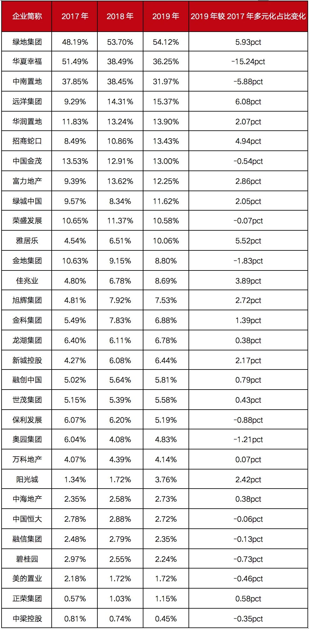表:2017年-2019年各企業(yè)多元化業(yè)務(wù)占總業(yè)務(wù)比重