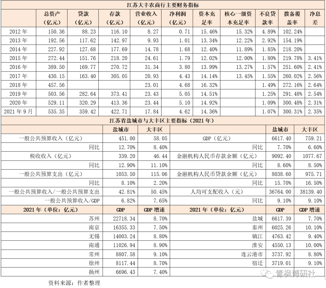 1、2012年以來,大豐農商行的總資產由最初的150億元增至2021年9月底的535億元,這一體量明顯偏小,目前全部上市銀行(含港股和A股)中,總資產最低的瀘州銀行也有1300多億元。