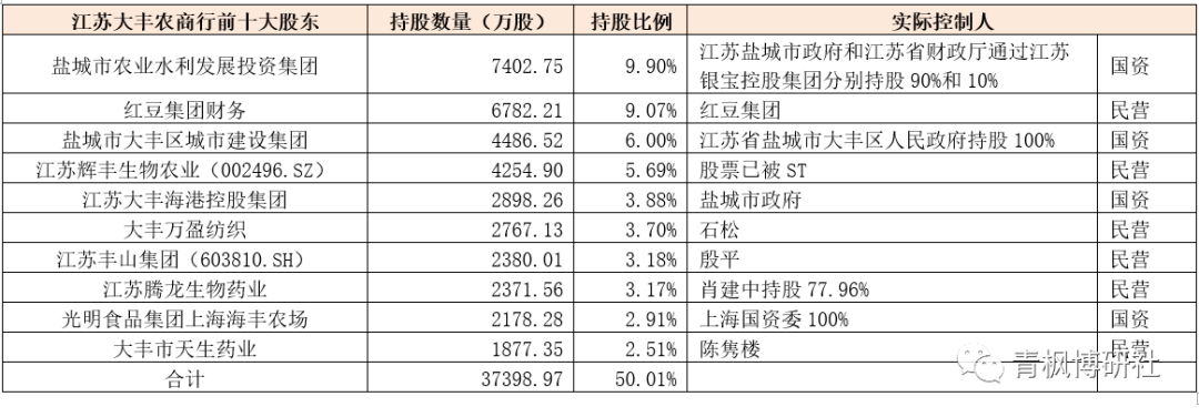 從江蘇大豐農商行的前十大股東來看,其股東背景整體偏弱,前十大股東中國資背景僅有4家(持股比例合計為22.69%),且國資背景的股東為財政實力較弱的鹽城市政府。此外,江蘇大豐農商行的民營背景股東實力也不強,如江蘇輝豐生物農業(002496.SZ)已被ST。