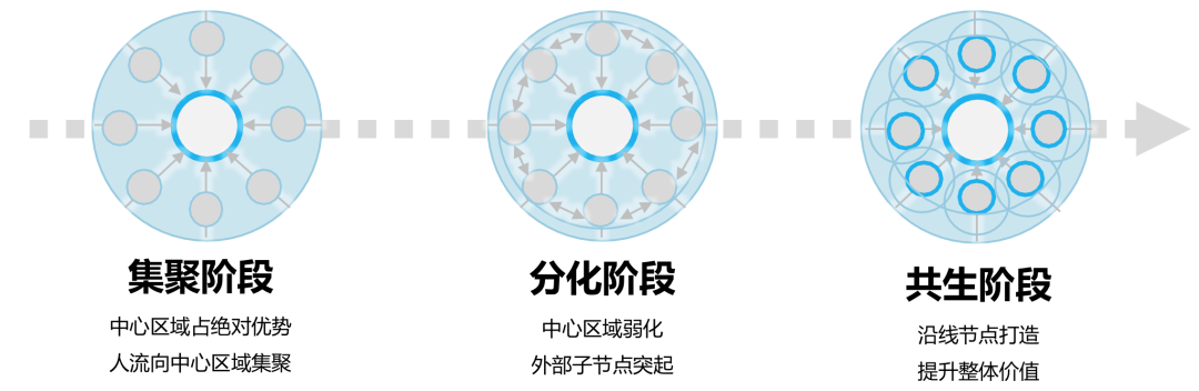 軌交經(jīng)濟(jì)發(fā)展經(jīng)歷了三個(gè)階段:第一個(gè)階段是以中心為核心中央集權(quán)型;第二個(gè)階段是以中心區(qū)域弱化、外部子節(jié)點(diǎn)突出為特征的分化階段;第三個(gè)階段則是以中心節(jié)點(diǎn)為源頭,沿廊道呈放射狀多節(jié)點(diǎn)打造為特征的共生階段。在共生階段下,沿線整體開(kāi)發(fā)是在堅(jiān)持可持續(xù)發(fā)展的理念下達(dá)到區(qū)域長(zhǎng)期聚攏人氣的有效策略。