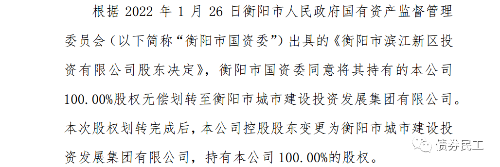 4、根據(jù)衡陽市濱江新區(qū)投資有限公司(主體信用等級AA)2022年1月28日的公告,衡陽市國資委同意將其持有的公司100.00%股權(quán)無償劃轉(zhuǎn)至衡陽市城市建設(shè)投資發(fā)展集團有限公司。衡陽市城市建設(shè)投資發(fā)展集團有限公司(主體信用等級AA+)存量債券金額為333億元,存量債券28只。
