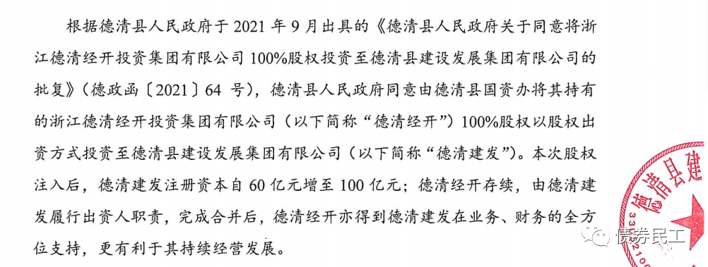 2、根據(jù)德清縣建設(shè)發(fā)展集團有限公司(主體信用等級AA+)2022年2月10日的公告,德清縣國資辦將其持有的浙江德清經(jīng)開投資集團有限公司100%股權(quán)以股權(quán)出資方式投資至公司。浙江德清經(jīng)開投資集團有限公司主體信用等級AA,債券存量金額為12.98億元。