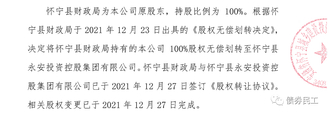 7、根據(jù)安徽省懷寧縣城鄉(xiāng)建設(shè)投資發(fā)展有限責任公司(主體信用等級AA-)2022年1月20日的公告,懷寧縣財政局決定將其持有的公司100%股權(quán)無償劃轉(zhuǎn)給懷寧縣永安投資控股集團有限公司。懷寧縣永安投資控股集團有限公司未發(fā)行過債券。