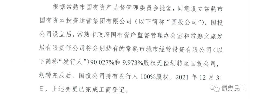 12、根據(jù)常熟市城市經(jīng)營投資有限公司(主體信用等級AA+)2022年1月4日的公告,公司的股東變更為常熟市國有資本投資運營集團有限公司。常熟市國有資本投資運營集團有限公司未發(fā)行過債券。