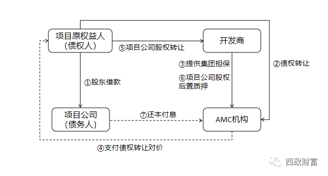1.AMC機構收購項目原權益人對項目公司的股東借款或其上游供應商對項目公司的應收未收工程款等債權,AMC向項目原權益人支付的債權轉讓對價款作為項目原權益人和開發商(收購方)之間的股權轉讓對價。