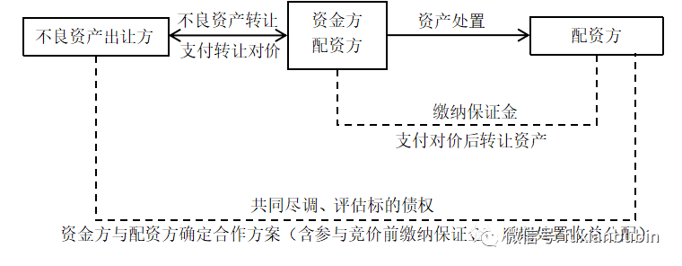 該類業務一般涉及三方當事人,即出讓方(原債權持有人,一般為擬組包轉讓不良資產的金融機構),資金方(一般為擁有資金優勢,且能夠在不良資產一級市場上開展不良資產批量收購的經營機構),配資方(一般為擁有較強不良資產處置能力和資源整合能力的民間經營機構),資金方與配資方合稱“受讓方”。其交易邏輯如下: