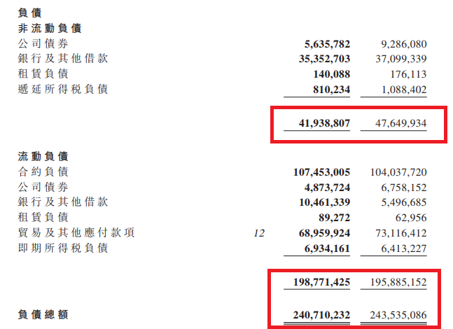 首先我們看非流動負債,公司債券、銀行及其他借款,都有一定的下滑;然后流動負債方面,雖然略有增長,但是總的負債如下圖,居然也略有減少。