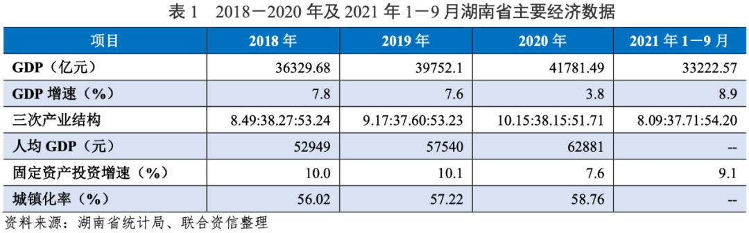 湖南省整體經濟實力較強,經濟總量位于全國中等偏上水平,人均GDP處于全國中等水平,經濟發展態勢良好。2021年前三季度,隨著“新冠”疫情影響的逐步減弱以及固定資產投資的回暖,湖南省經濟水平大幅回升。2020年,湖南省一般公共預算收入規模處于全國各省市自治區中上游水平,財政自給能力偏弱,整體財政實力一般;湖南省負債率及債務率在全國各?。ㄗ灾螀^、直轄市)中均處于相對較高水平,債務負擔相對較重。