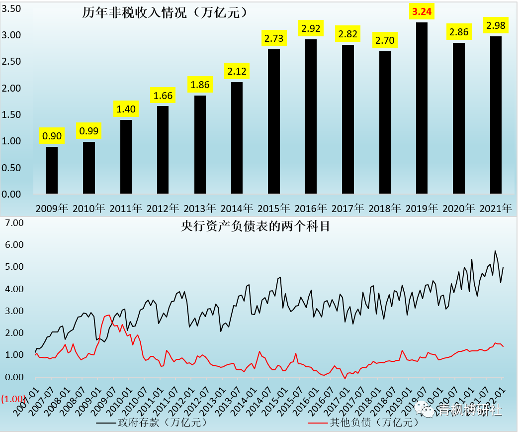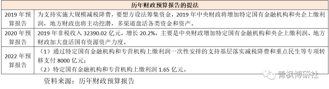 雖然2019年預算報告提出將增加特定國有金融機構(gòu)和央企上繳利潤,并導致2019年非稅收入同比大幅增加6543億元。但受疫情因素影響,2020-2021年特定國有金融機構(gòu)和專營機構(gòu)利潤上繳事宜被暫停。這就意味著2020-2021年兩年期間特定國有金融機構(gòu)和和專營機構(gòu)是有結(jié)存利潤的,因此2022年預算報告再次提出的該事項,實際上早在2019年便已經(jīng)做了。