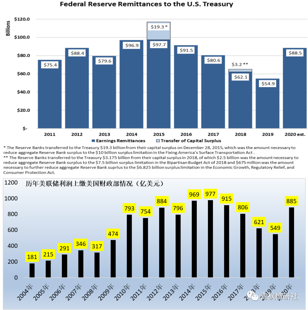 實際上,中央銀行將扣除運營費用、利息支出等之后的利潤上繳財政,是目前主要經(jīng)濟體的通行做法,《美聯(lián)儲法案》、《日本銀行法》、《英格蘭銀行法》對此都有相應規(guī)定。數(shù)據(jù)上看,2020年美聯(lián)儲向美國財政部上交了885億美元的 盈利,較2019年的549億美元大幅增長61.20%。