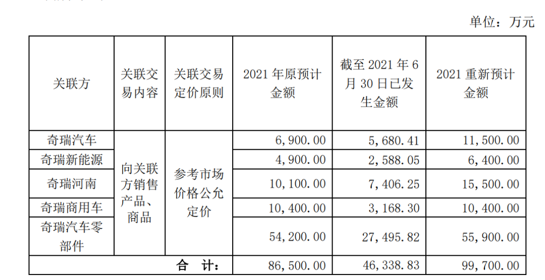 2021年9月末,伯特利曾披露《關于增加預計公司2021年度日常關聯交易的公告》。公司基于2021年上半年與奇瑞汽車及其關聯方業務開展情況以及發生的實際交易金額,預計公司2021年全年與奇瑞汽車及其關聯方將增加關聯交易1.32億元。