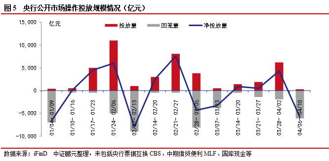 清明節(jié)后第一周只有三個工作日,月初整體資金寬裕。央行7天逆回購投放300億元,7天逆回購到期6,100億元,合計凈回落5,800億元。上周國常會提出適時動用貨幣政策工具,債市博弈降準,出現(xiàn)邊際回暖。關(guān)注本周的社融數(shù)據(jù)和15號MLF續(xù)期情況。