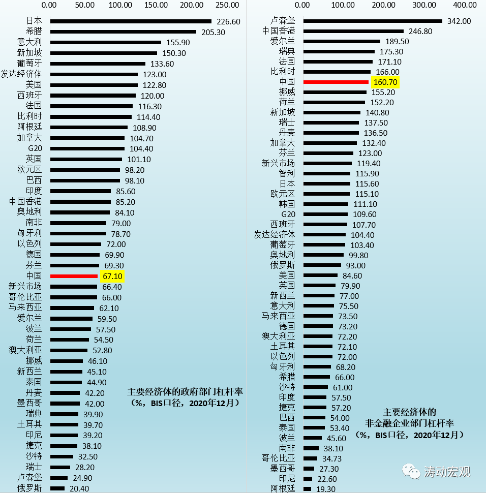 如果不考慮政府隱性債務(wù),則中國政府部門的宏觀杠桿率處于可控位置,2020年12月為67.10%,和新興市場經(jīng)濟(jì)體的66.40%以及德國的69.90%基本相當(dāng),低于印度的85.60%和美國的122.80%。