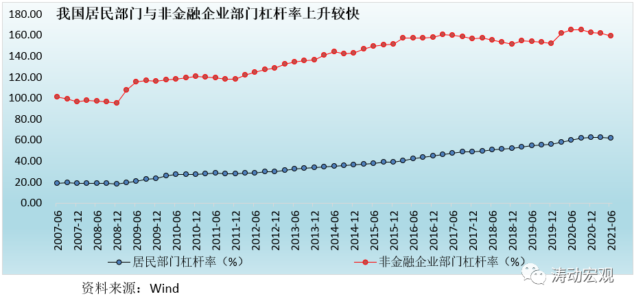 08年金融危機(jī)以來,我國非金融企業(yè)部門和居民部門的杠桿率上升較快。其中,居民部門杠桿率已從2008年的17.90%大幅升至2021年6月的62%,12年的時(shí)間里累計(jì)上升了44個百分點(diǎn);非金融企業(yè)部門杠桿率則從2008年的95.20%大幅升至目前的158.80%,12年的時(shí)間里累計(jì)上升了63.60個百分點(diǎn)。