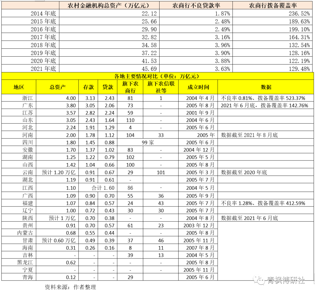 目前省聯(lián)社仍在起著主導(dǎo)作用且具有公開(kāi)信息可供查詢(xún)的地區(qū)主要有23個(gè),北京、上海、重慶、天津、寧夏與陜西等地區(qū)已組建轄區(qū)統(tǒng)一的農(nóng)商行取代省聯(lián)社,而西藏與新疆地區(qū)未披露相關(guān)信息。上述23個(gè)地區(qū)在2021年底的總資產(chǎn)合計(jì)超過(guò)35萬(wàn)億,占據(jù)全部農(nóng)村金融機(jī)構(gòu)體量(超過(guò)45萬(wàn)億)的76%以上。