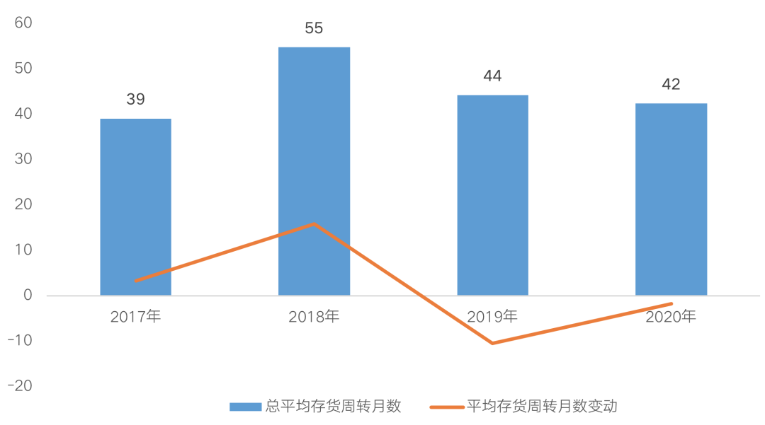 2019年房企增長速度明顯放緩,市場整體去化承壓,行業視角回歸至去庫存。2020年,突遇新冠疫情,開工與施工進度被推遲,隨著經濟秩序逐漸恢復,下半年以來房企積極趕工,全年存貨周轉天數較2019年進一步縮短,平均存貨周轉月數為42個月(約3.5年),較上年下降1.8個月(約54天)。