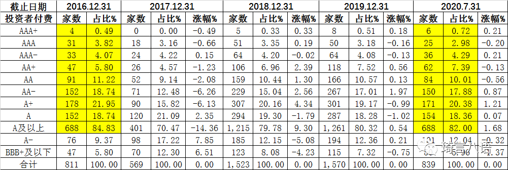 截至2020年7月31日,大公國際等發(fā)行人付費的外部評級機構(gòu)的評級分布及變化情況如下: