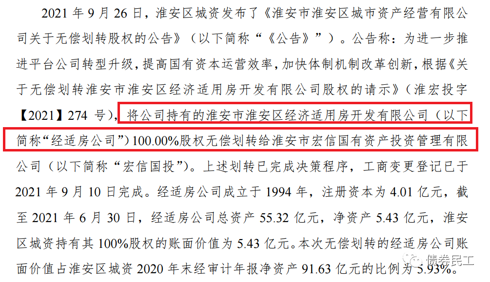 1、淮安市淮安區城市資產經營有限公司公告,將公司持有的淮安市淮安區經濟適用房開發有限公司的股權無償劃轉給淮安市宏信國有資產投資管理有限公司(控股股東為淮安區人民政府)。
