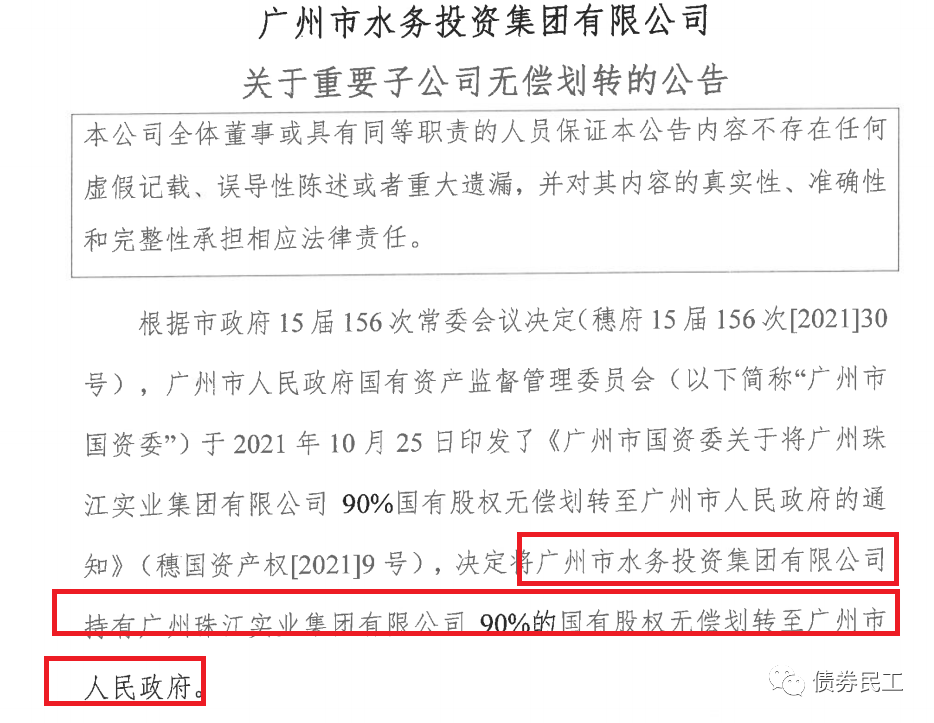 3、廣州市水務投資集團有限公司(主體信用評級為AAA)公告,將公司持有的廣州珠江實業集團有限公司90%的股權無償劃轉給廣州市人民政府。此次劃轉完成之后,公司不再持有廣州珠江實業集團有限公司的股權。