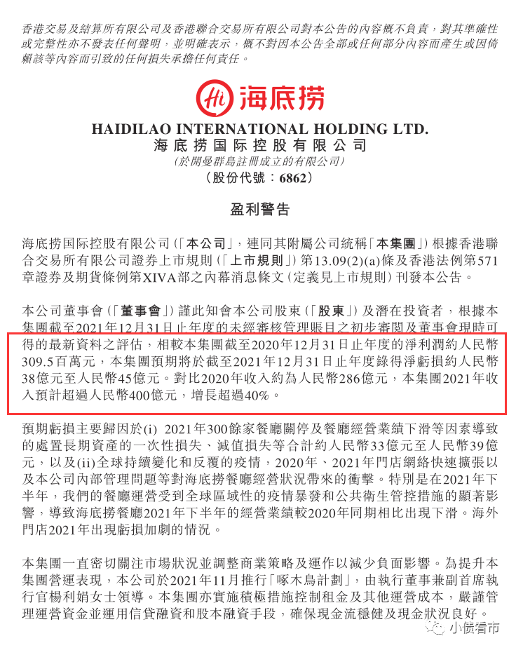 2月21日,海底撈盈利預警顯示,預計2021年將錄得38億-45億元的凈虧損,其中大部分與300多家餐廳關閉和停業造成的一次性虧損有關,一次性損失約33億-39億元。