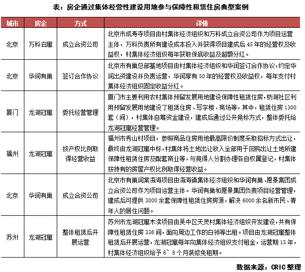 雖然房企參與保障性租賃住房規模不大,但仍有部分房企積極與政府合作,試水該領域。根據住建部2021年11月及2022年2月發布的兩批《發展保障性租賃住房可復制可推廣經驗清單》來看,多家房企通過集體經營性建設用地參與保障性租賃住房建設,這些房企包括萬科泊寓、華潤有巢及龍湖冠寓,參與方式包括成立合資公司、整租后開展運營、委托經營管理等等。