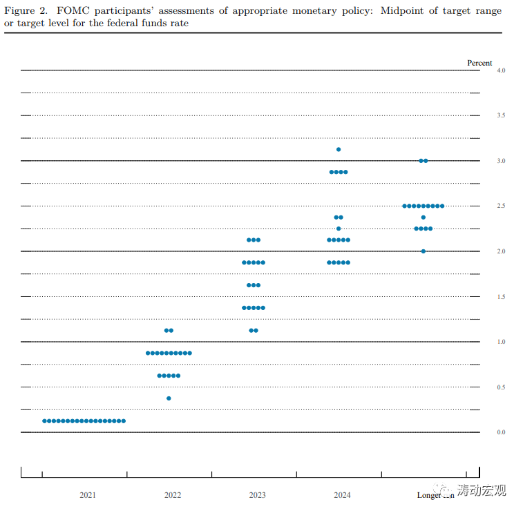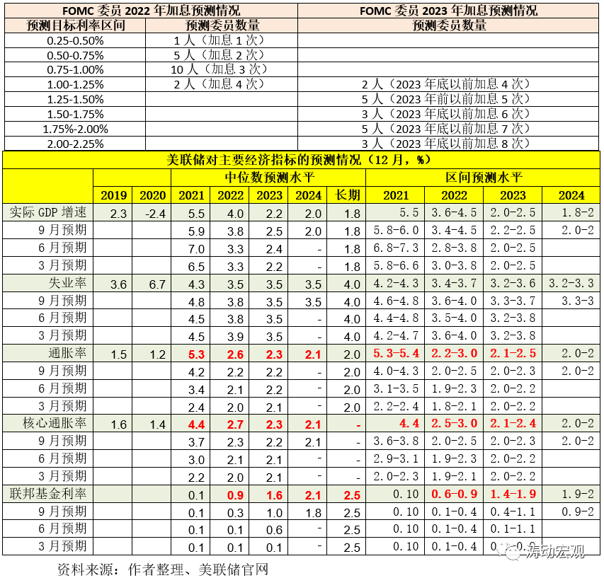 2、大幅上調(diào)了2022-2023年的聯(lián)邦基金利率預期,將2022年與2023年的聯(lián)邦基金利率預期區(qū)間分別由9月的0.1-0.4和0.4-1.1提升至0.6-0.9和1.4-1.9,即2022年與2023年聯(lián)邦基金利率分別上調(diào)60-75BP和100BP,也即2022與2023年將分別需要加息3次。