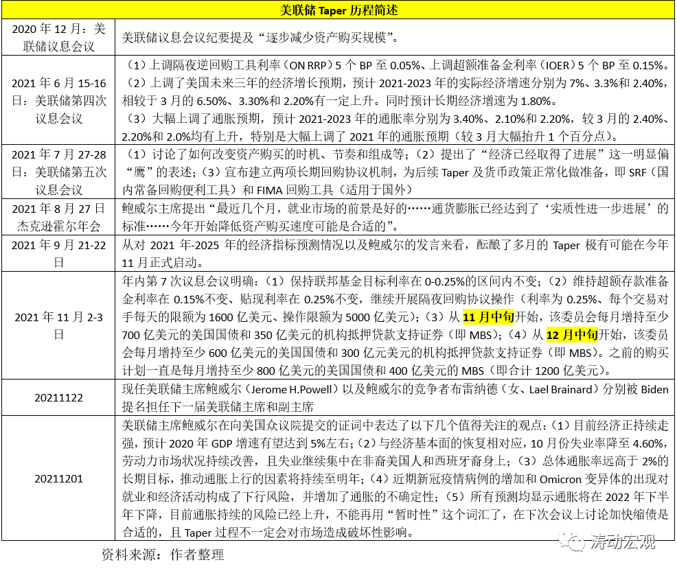 意味著2022年1月的縮減購債規(guī)模是11月和12月的兩倍,將完成Taper的時間由11月預期的2022年6月大幅提升至2022年3月。