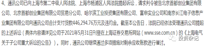 第四,公司把情況預(yù)計的比較悲觀,有一種著急甩鍋的感覺。一般出減值公告,公司盡可能還是往好處說,上海電氣這個就比較有意思,直接往最悲觀的情況去說,假設(shè)了所有壞賬都收不回來,通訊公司自己的借款可能還不上,股東借款也打水漂了。這種一毛錢都收不回來的概率還是比較小的,這么悲觀的預(yù)測一方面可能與上海電氣國企身份有關(guān),一方面就有點著急甩鍋的感覺。不知道是不是和領(lǐng)導(dǎo)的變化也有關(guān)系。