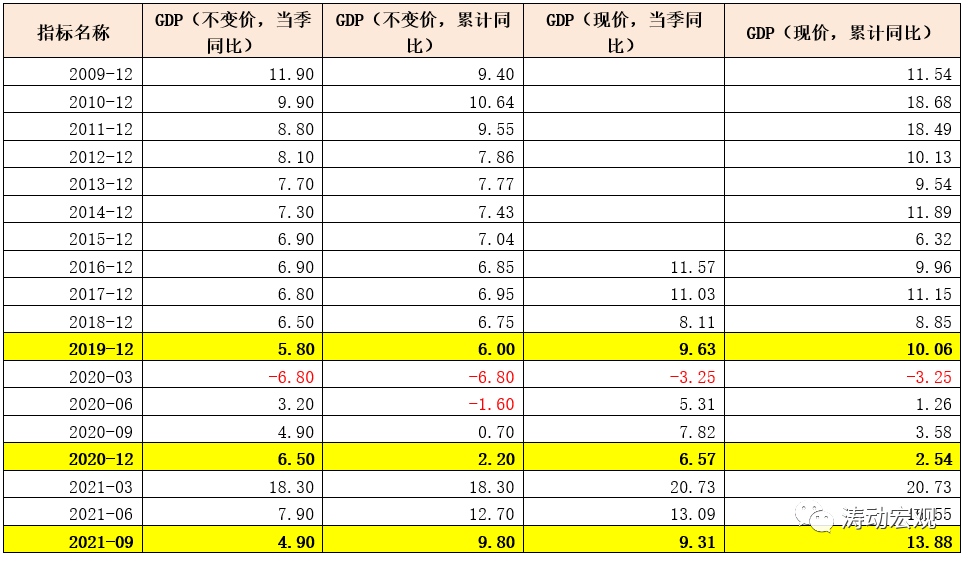 相較于2020年的V型修復(fù),2021年經(jīng)濟(jì)則呈現(xiàn)出典型的“倒V型”下行態(tài)勢(shì),今年二季度以來經(jīng)濟(jì)下行壓力開始逐漸凸顯。所以我們看到,政策層面實(shí)際上自今年三季度開始,呈現(xiàn)出逐步放松的跡象。數(shù)值上看,今年一季度、二季度和三季度當(dāng)季經(jīng)濟(jì)同比增速分別為18.30%、7.90%和4.90%,兩年平均增速(當(dāng)季值)分別為5.00%、5.50%和4.90%,考慮到四季度經(jīng)濟(jì)下行壓力仍在持續(xù)(預(yù)計(jì)四季度當(dāng)季增速可能會(huì)降至4.50%),基于此粗略判斷2021年全年經(jīng)濟(jì)增速在8%左右(已超過兩會(huì)制定的6%以上目標(biāo)),兩年平均增速預(yù)計(jì)為5.0%。