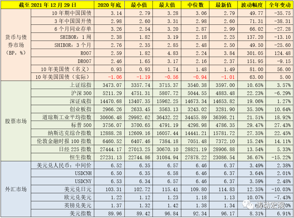 潮起潮落下,一切即將塵埃落定?;赝?021年全年,應(yīng)清醒地認(rèn)識(shí)到,當(dāng)前全球經(jīng)濟(jì)只是反彈,還未真正復(fù)蘇,多數(shù)經(jīng)濟(jì)體并未恢復(fù)到疫情前水平,一些問題的存在仍然讓人頭疼,如疫情起伏反復(fù)嚴(yán)重干擾復(fù)蘇進(jìn)程、不同地區(qū)復(fù)蘇分化發(fā)展失衡威脅增長(zhǎng)的可持續(xù)性、高企的通脹尚未出現(xiàn)緩解跡象(對(duì)企業(yè)和民眾的困擾需要引起關(guān)注),供應(yīng)鏈產(chǎn)業(yè)鏈?zhǔn)茏璧摹半[患”仍在間歇性發(fā)作、新興經(jīng)濟(jì)體和發(fā)展中國家對(duì)美聯(lián)儲(chǔ)政策節(jié)奏的變化憂心忡忡等等。過去這一年,雖然中國經(jīng)濟(jì)總量即將邁入110萬億元大關(guān)、人均GDP將達(dá)到1.20萬美元(逼近高收入國家水準(zhǔn)),但我們卻經(jīng)歷了經(jīng)濟(jì)基本面的倒“V”型反轉(zhuǎn)和下半年以來的超預(yù)期下行,經(jīng)歷了A股市場(chǎng)近幾年以來表現(xiàn)最為一般的一年(雖然創(chuàng)業(yè)板仍在繼續(xù)大幅上行以及A股全年成交金額突破2015年的紀(jì)錄)以及恒指連續(xù)兩年的下挫,亦經(jīng)歷了2015年以來人民幣匯率波動(dòng)幅度最小的一年(全年不到4%)。同樣是這一年,美聯(lián)儲(chǔ)Taper進(jìn)程明顯加快以及加息步伐預(yù)期明顯提前、美元指數(shù)與美債收益率顯著上行、美國三大股指引領(lǐng)全球,中國與美國之間的第二階段博弈在Biden時(shí)代的第一年迎來了新的特征以及地緣政治格局博弈愈加劇烈。依然是這一年,我們看到雖然中國經(jīng)濟(jì)在疫情之后率先反彈,但在反彈之后經(jīng)濟(jì)基本面亦比其它經(jīng)濟(jì)體率先進(jìn)入下行通道(今年1-3季度的當(dāng)季GDP增速分別為5%、5.50%和4.90%),未來若干年的中國經(jīng)濟(jì)可能均需要為保“5%”而不斷努力,年終政治局會(huì)議與中央經(jīng)濟(jì)工作會(huì)議則相應(yīng)提出“穩(wěn)字當(dāng)頭、穩(wěn)住宏觀經(jīng)濟(jì)大盤”的政策基調(diào),并做出“需求收縮、供給沖擊、預(yù)期轉(zhuǎn)弱”的基本判斷,因?yàn)檎卟块T與市場(chǎng)均應(yīng)認(rèn)識(shí)到,經(jīng)濟(jì)基本面的運(yùn)行是有慣性的且某種程度上不以人的意志為轉(zhuǎn)移,經(jīng)濟(jì)增速一旦落下來,就很難再上去,所以現(xiàn)在要讓它落的慢一些、溫柔一些,從這個(gè)角度看持續(xù)收緊的貨幣環(huán)境應(yīng)已很難重現(xiàn)。還是這一年,城投政策趨嚴(yán)與地產(chǎn)行業(yè)重塑牽動(dòng)著整個(gè)市場(chǎng)的神經(jīng),綠色金融漸成氣候、碳貨幣趨勢(shì)愈發(fā)明顯,新三板、北交所、創(chuàng)業(yè)板與科創(chuàng)板正持續(xù)為科創(chuàng)類企業(yè)提供加持平臺(tái)。
