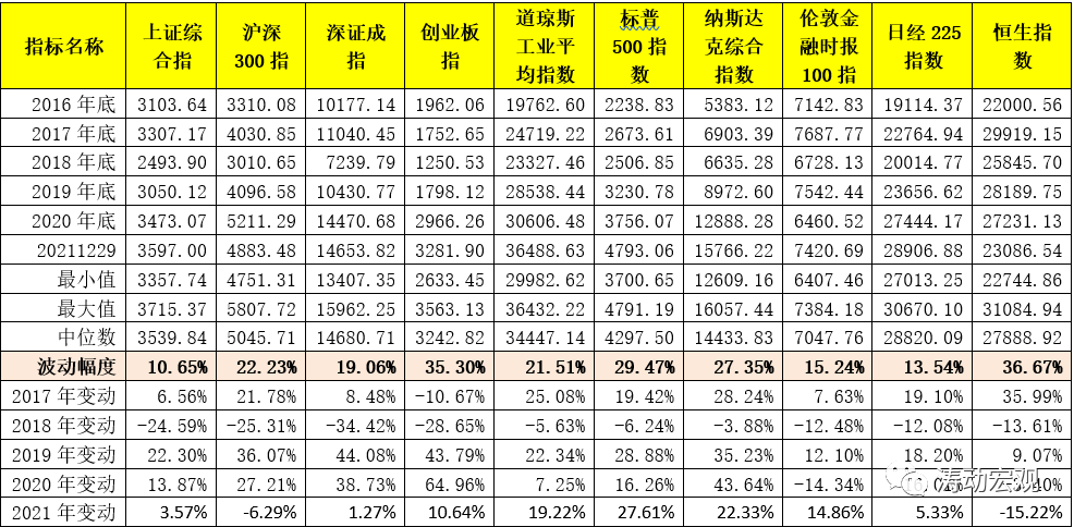 2、相較于2019-2020年的股市,2021年的股市表現(xiàn)整體一般,上證綜指略微上揚(yáng)3.57%、滬深300下挫6.29%、創(chuàng)業(yè)板指上揚(yáng)10.64%,成為表現(xiàn)最亮眼的A股板塊。同時(shí)美國三大股指繼續(xù)大幅上揚(yáng),但恒生指數(shù)已經(jīng)連續(xù)兩年下行、分別下挫3.70%和15.22%。