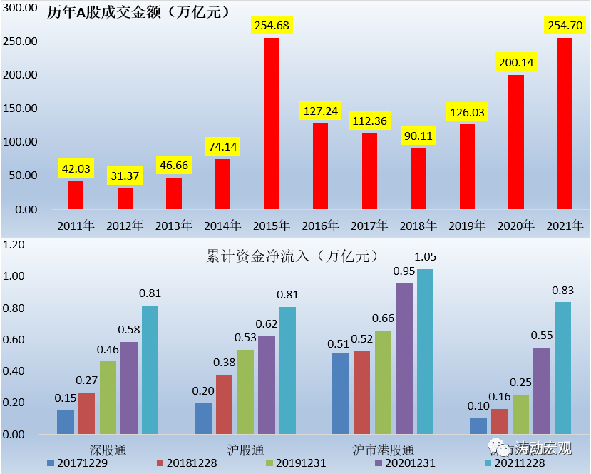(4)注冊(cè)制將于2022年在A股市場(chǎng)全面實(shí)施,有助于增強(qiáng)A股市場(chǎng)的吸引力。從成交量來看,2021年的A股市場(chǎng)表現(xiàn)較為活躍,為A股持續(xù)處于慢牛行情中打下了堅(jiān)實(shí)基礎(chǔ)。具體看,2021年以來A股全年成交量已經(jīng)達(dá)到254.70萬億元,突破2015年創(chuàng)下的歷史高點(diǎn),且2019年以來成交量連續(xù)三年上升。