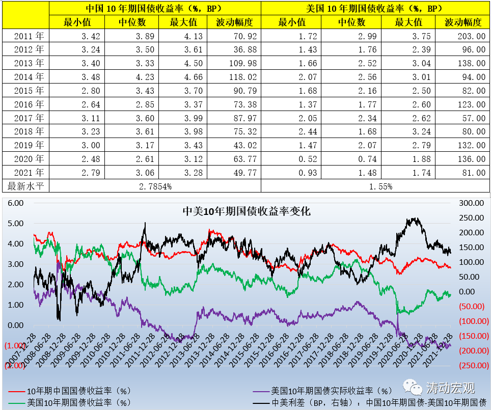 (2)在經(jīng)濟(jì)基本面弱勢(shì)格局比較明顯、政策寬松方向比較明確的背景下,2022年的債市運(yùn)行將能夠獲得一定支撐,但極端情況下基本不太可能觸及2020年的低點(diǎn)(2.48%),可能會(huì)將2020年的中樞數(shù)水平(2.60%)作為了運(yùn)行下限,2021年的下限(2.80%)作為中樞數(shù)水平的一個(gè)參考,中樞水平大致為2.8-2.9%之間,10年期國債收益率運(yùn)行的波動(dòng)幅度預(yù)計(jì)在40-70BP之間(2019-2020年的波動(dòng)幅度分別為43BP、64BP和50BP)。