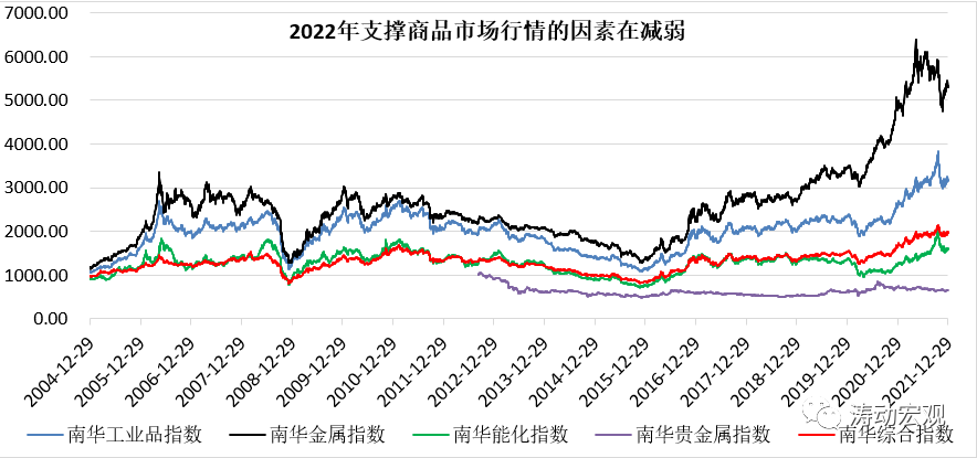 相較于其股債匯市場(chǎng),商品市場(chǎng)與經(jīng)濟(jì)基本面之間的關(guān)聯(lián)性更強(qiáng)。大的周期來看,商品市場(chǎng)的這一波牛市行情持續(xù)時(shí)間較長(zhǎng),主要得益于2015年以來的供給側(cè)改革(去產(chǎn)能)+經(jīng)濟(jì)修復(fù)階段(對(duì)供給收縮與需求修復(fù))的預(yù)期強(qiáng)化。但隨著國內(nèi)經(jīng)濟(jì)基本面的弱化、海外生產(chǎn)的修復(fù)以及政策層面對(duì)炒作大宗商品的打壓,我們認(rèn)為支撐2022年行情大宗商品的因素有所減弱,需要做好心理準(zhǔn)備。