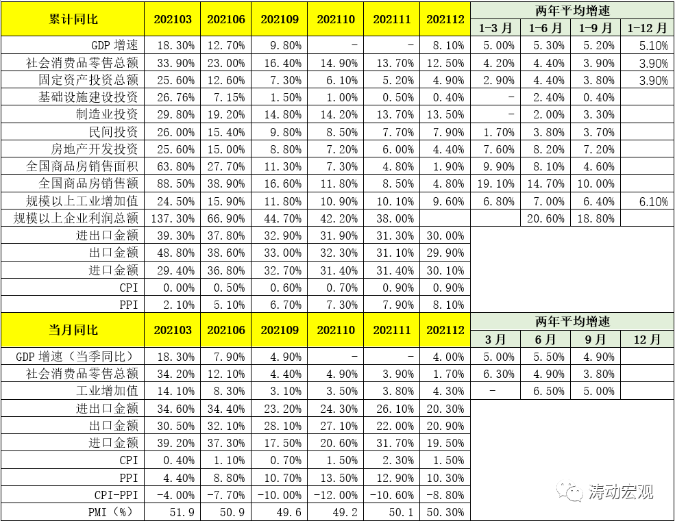 具體看,2021年全年經(jīng)濟增速達到8.10%(超過6%以上的經(jīng)濟增速目標(biāo)),全年兩年平均經(jīng)濟增速達到5.10%,但2021年一至四季度當(dāng)季經(jīng)濟增速分別為18.30%、7.90%、4.90%與4%,累計經(jīng)濟增速則分別為5%、5.30%、5.20%和5.10%,呈現(xiàn)出2021年下半年以來經(jīng)濟下行壓力逐漸增大的特征。