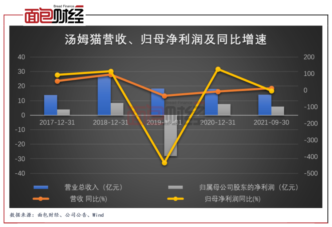 圖3:2017年至2021年前三季度湯姆貓營收、歸母凈利潤及同比增速