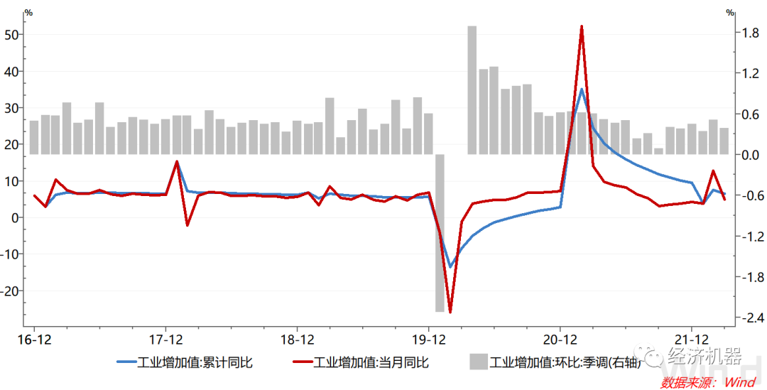 圖2、工業(yè)增加值:累計同比、當(dāng)月同比、季調(diào)環(huán)比