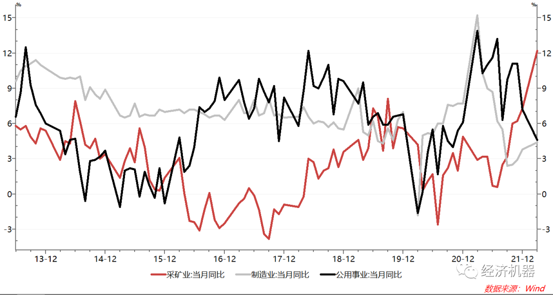 分行業(yè)看,采礦業(yè)持續(xù)高速增長。從行業(yè)看,3月,采礦業(yè)增加值當(dāng)月同比增長12.2%,連續(xù)7個月加速,且顯著高于往年3%左右的平均增速。制造業(yè)當(dāng)月同比增長4.4%,也呈現(xiàn)小幅加速跡象。公用事業(yè)同比同比增速則較上月出現(xiàn)較大下滑(圖3)。采礦業(yè)今年的高速增長與中央近來持續(xù)強調(diào)保障電力煤炭等能源穩(wěn)定供應(yīng)有關(guān),也與近期大宗商品價格維持在高位密切相關(guān)、行業(yè)維持高景氣有關(guān)。