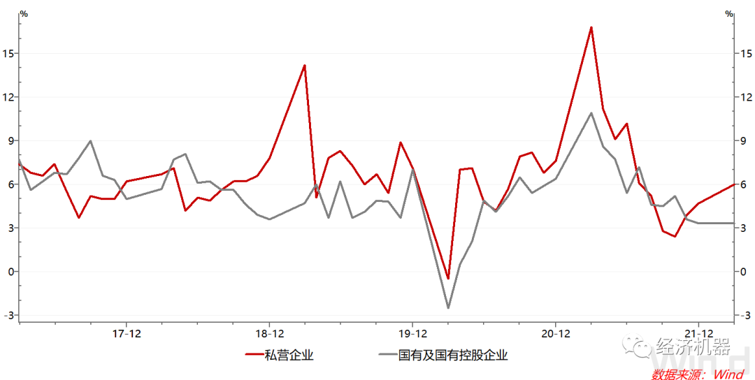 從所有制類型看,私營企業(yè)增加值持續(xù)提速。3月份增加值增速達到6%,連續(xù)3個月加速。與之對比,國有企業(yè)增速則在持續(xù)回落,3月維持在3.3%,與上月持平(圖4)。私營企業(yè)的恢復(fù)表明營商環(huán)境的持續(xù)改善,這與去年近來對“能耗雙控”政策的調(diào)整放松,以及今年支持中小微企業(yè),持續(xù)推進減稅退稅工作是一致的。