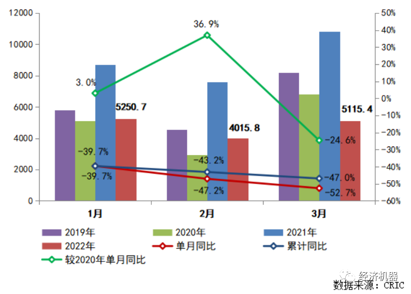 3月克而瑞數(shù)據(jù)也顯示,100強房地產(chǎn)開發(fā)企業(yè)單月實現(xiàn)銷售金額5115.4億元,單月同比降低52.7%,較2020年同期下跌24.6%,累計同比下跌52.7%。