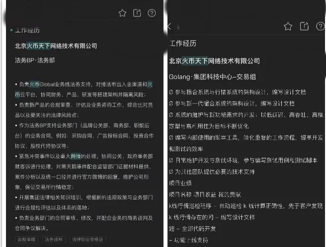 上述用戶的共同點(diǎn)在于,大量huobi global工作人員在北京火幣天下網(wǎng)絡(luò)科技有限公司入職,期間涉及多個(gè)部門,工作內(nèi)容也都涉及到實(shí)際業(yè)務(wù)運(yùn)營,還包括不同部門之間的對(duì)接協(xié)調(diào)。
