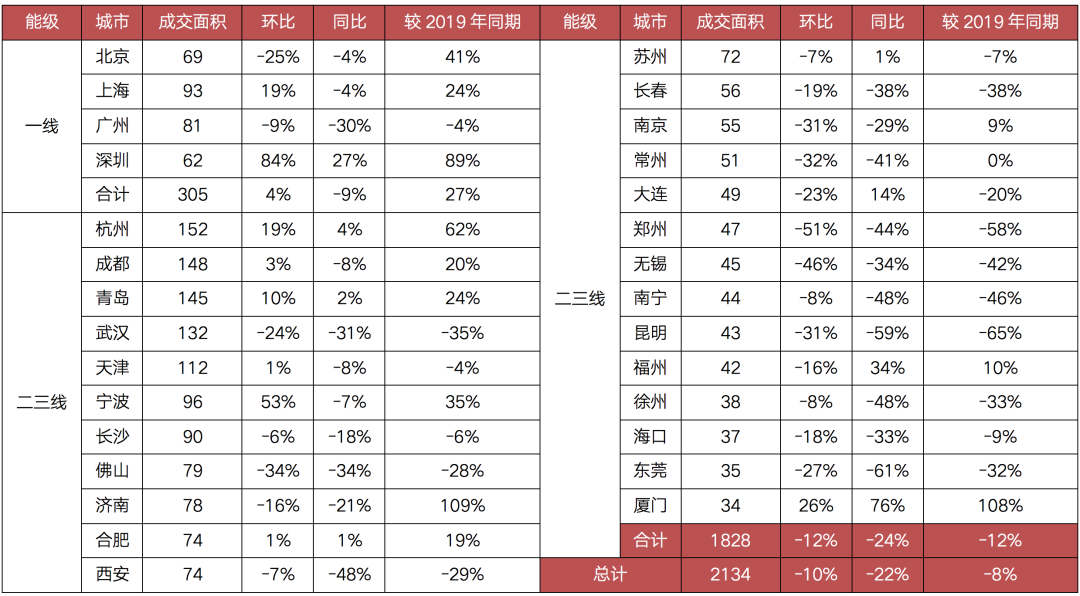 具體來看,一線城市韌性相對較強,但亦增幅收窄甚至同比轉跌,8月成交新房305萬平方米,環比微增4%,同比下降9%,較2019年同期增長27%。