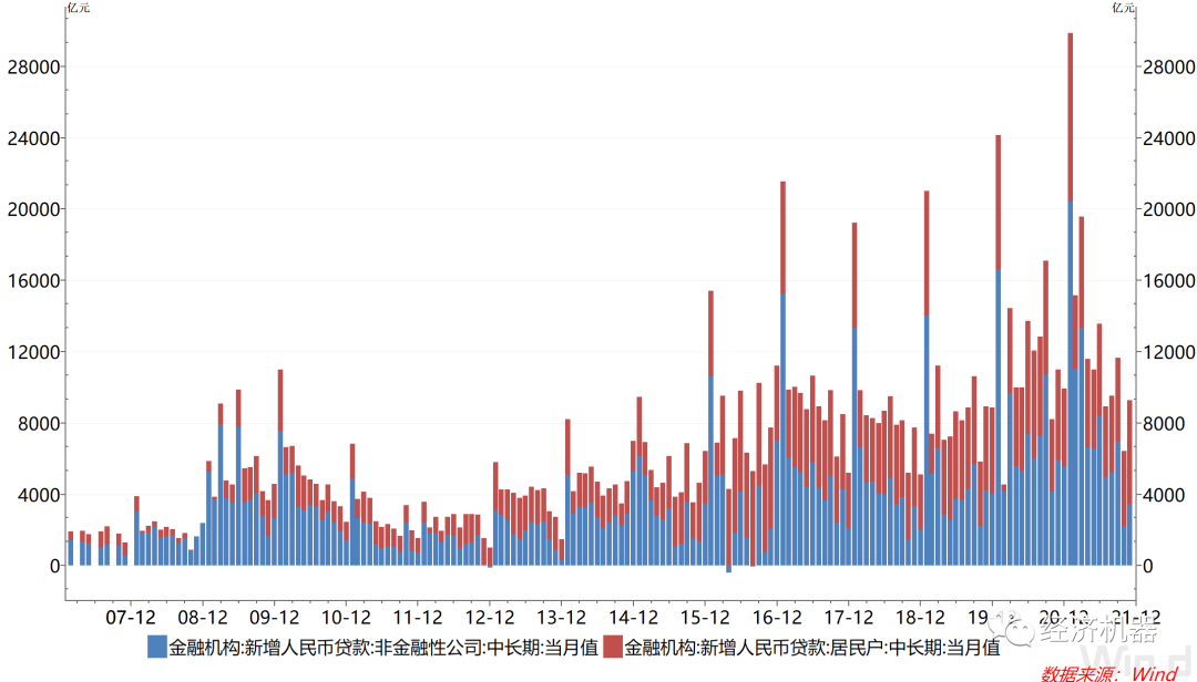 2)新增中長(zhǎng)期貸款中,非金融企業(yè)貸款新增出現(xiàn)明顯下降,家庭和房地產(chǎn)貸款維持高位。11月中長(zhǎng)期貸款中,非金融公司中長(zhǎng)期貸款新增3417億,同比少增2470億元,較2019年同期還低約790億元。雖然11月企業(yè)生產(chǎn)有顯著改善,但信貸需求依然疲弱,可能表明企業(yè)對(duì)未來(lái)依然較為謹(jǐn)慎。
