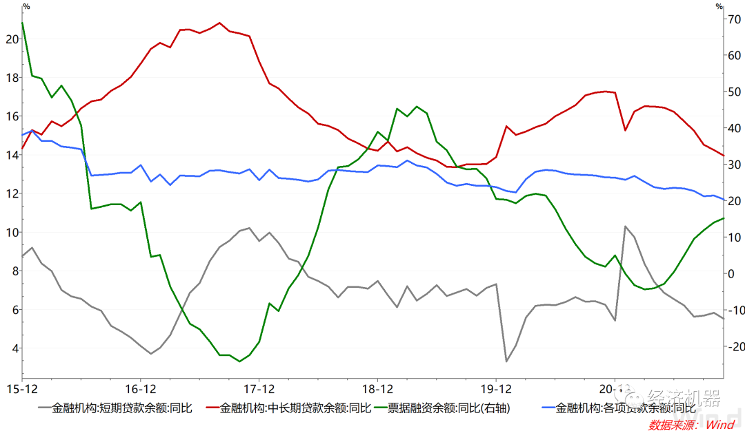 3)余額同比看,人民幣貸款增速與上月基本持平,有初步企穩(wěn)的跡象。11月,各項(xiàng)貸款余額同比增長(zhǎng)11.7%,較上月微跌0.02個(gè)百分點(diǎn),2021年2月份以來(lái)增速持續(xù)回落的態(tài)勢(shì)得到緩解。分項(xiàng)來(lái)看,中長(zhǎng)期貸款余額同比增速持續(xù)下滑,票據(jù)融資同比增速持續(xù)走高,表明信貸結(jié)構(gòu)變化趨勢(shì)延續(xù)。